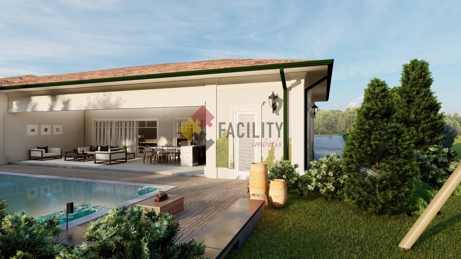 A área externa é complementada por uma deslumbrante piscina, proporcionando momentos de lazer e relaxamento para toda a família.