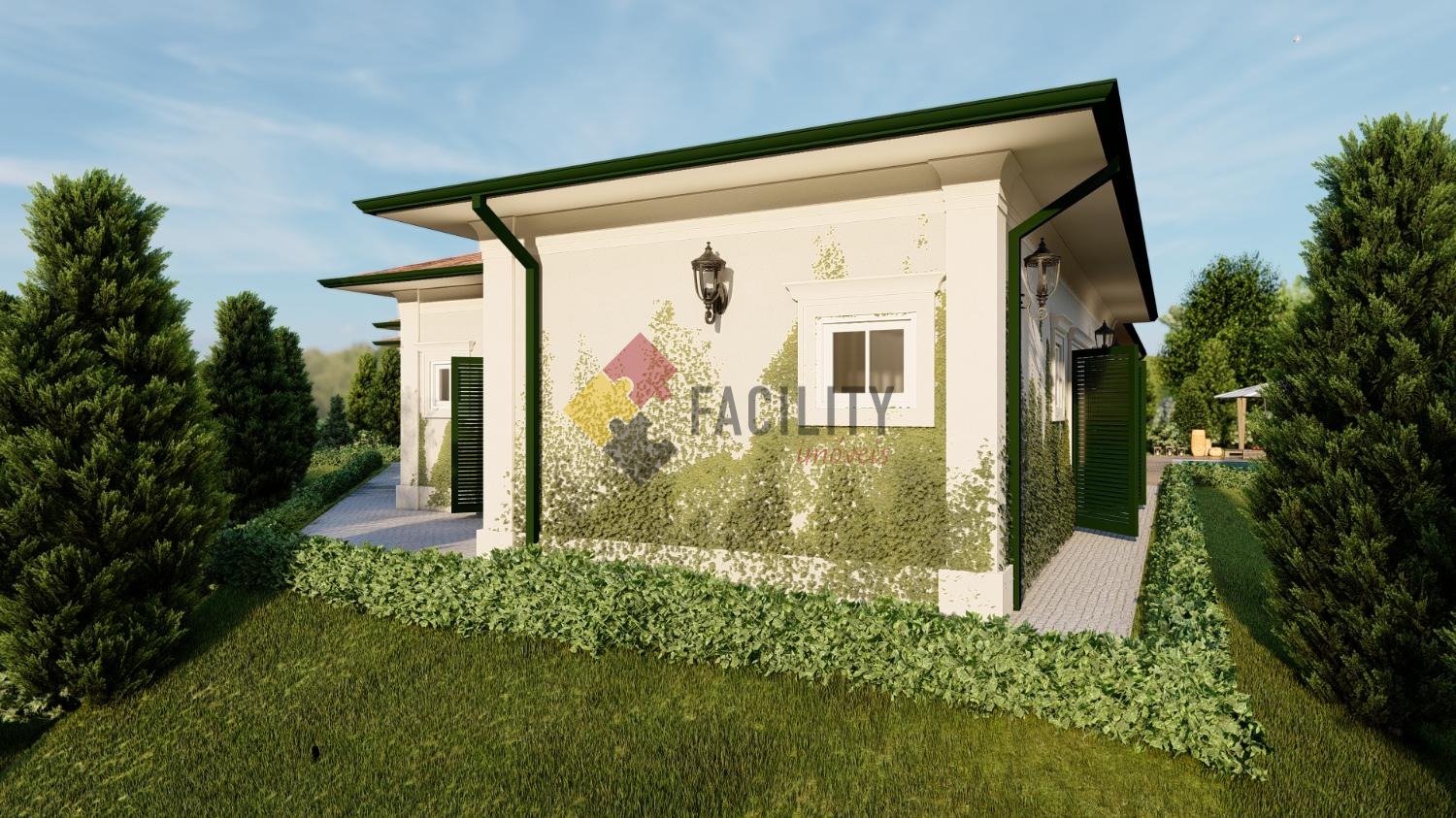 A área externa é complementada por uma deslumbrante piscina, proporcionando momentos de lazer e relaxamento para toda a família.