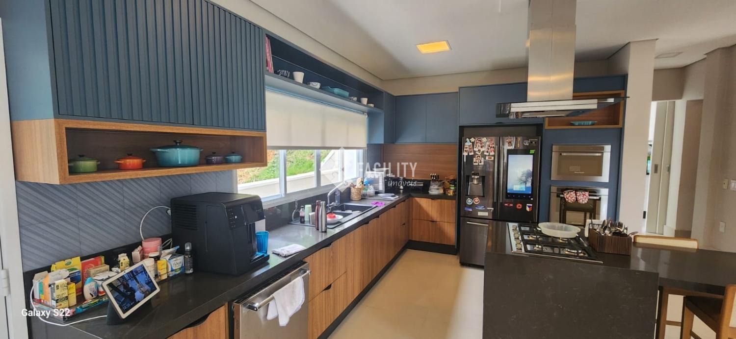 Cozinha gourmet completamente equipada, com ilha central, eletrodomésticos de última geração e despensa.