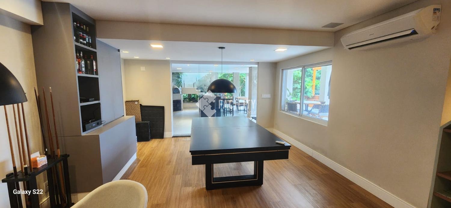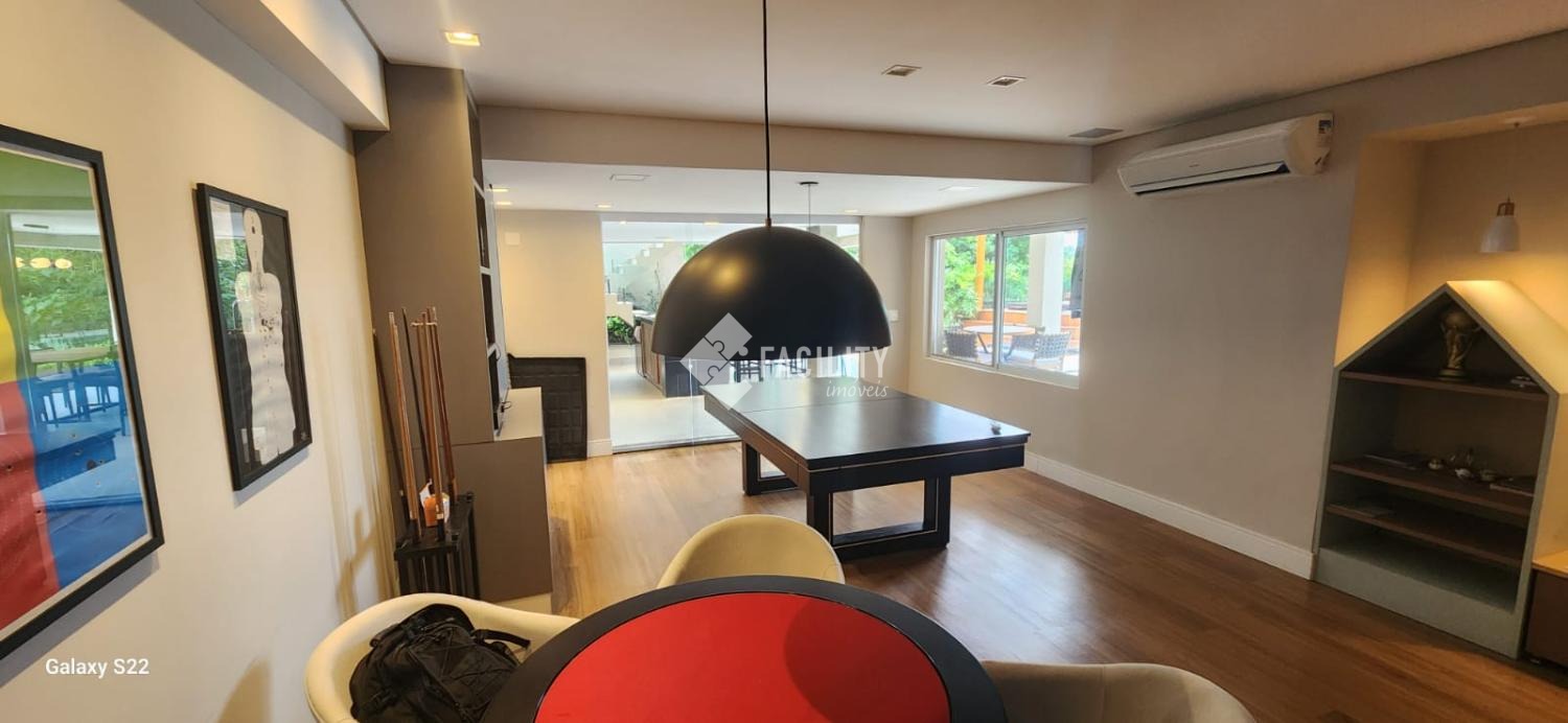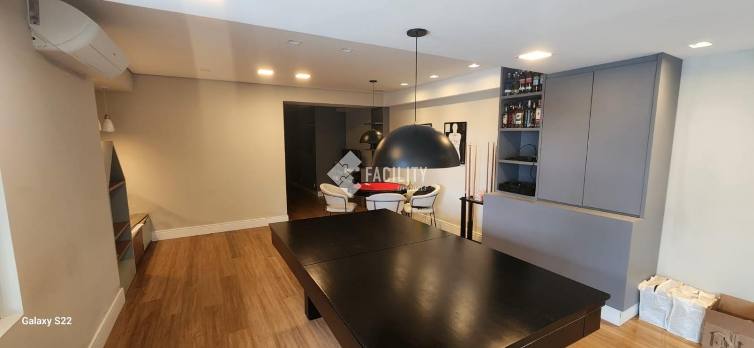 Salão de jogos climatizado e equipado com mesa de sinuca, TV de tela plana e sistema de som ambiente.