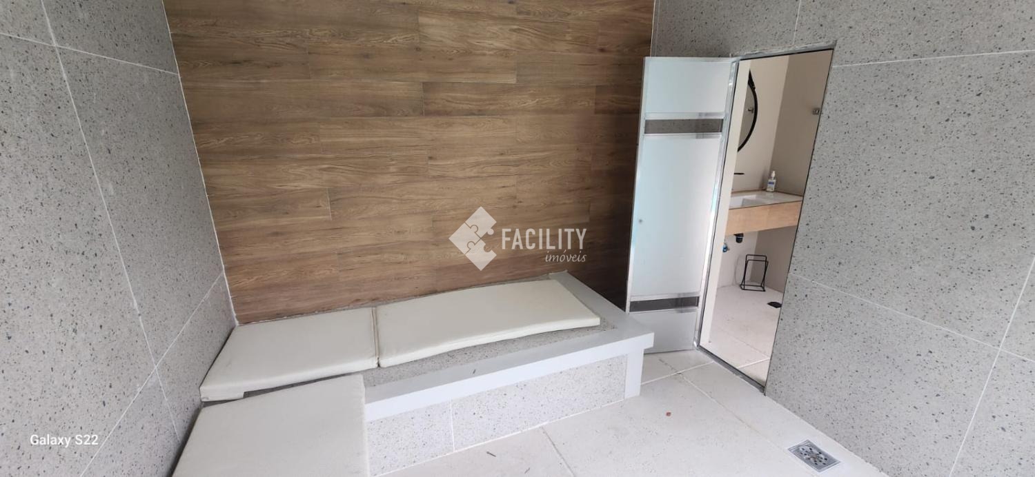 Sauna úmida revestida em mármore, proporcionando relaxamento e bem-estar.