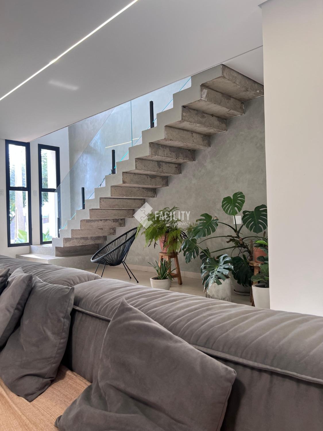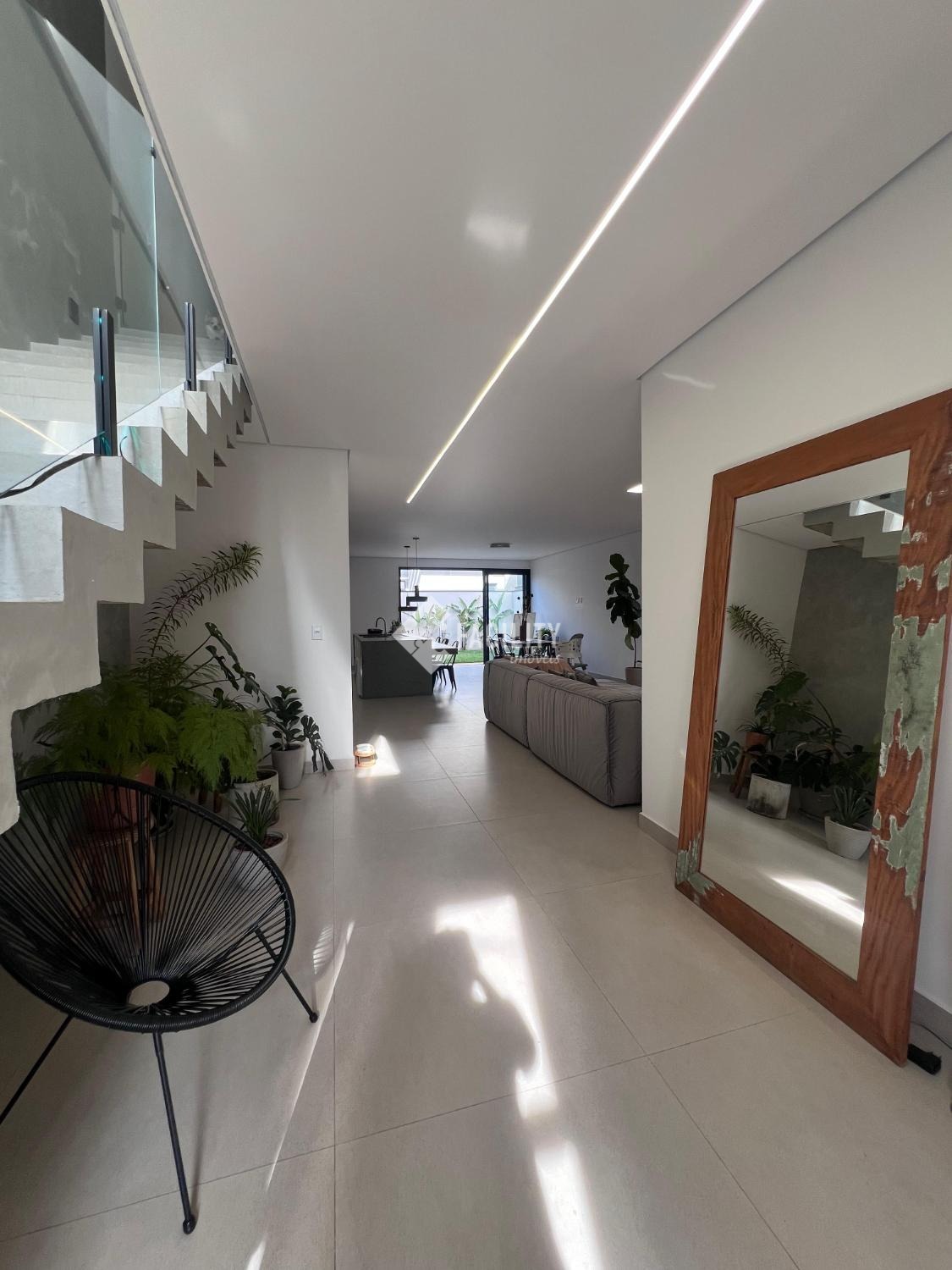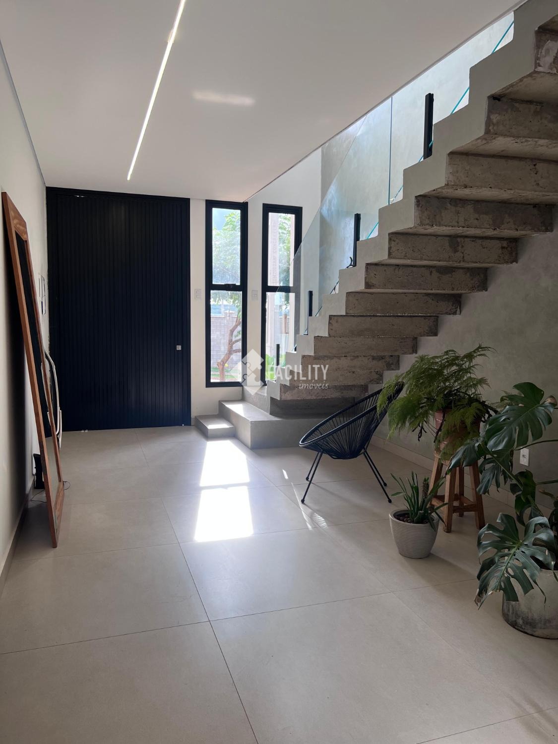 Sala em conceito aberto e amplo com hall de entrada sala de jantar e cozinha, Lavabo, Quintal com espaço para academia, Lavanderia, Escada em concreto com espaço em baixo.