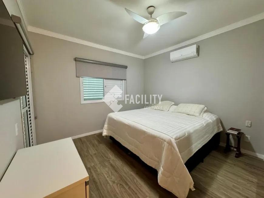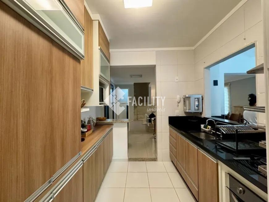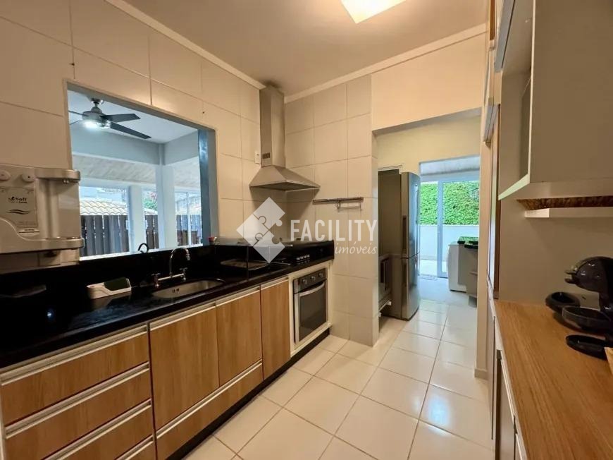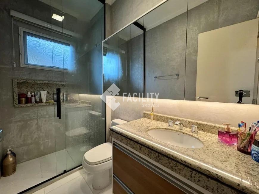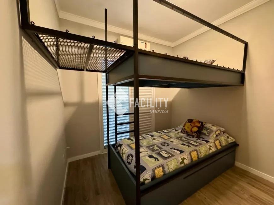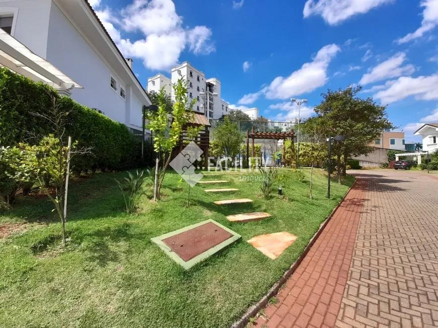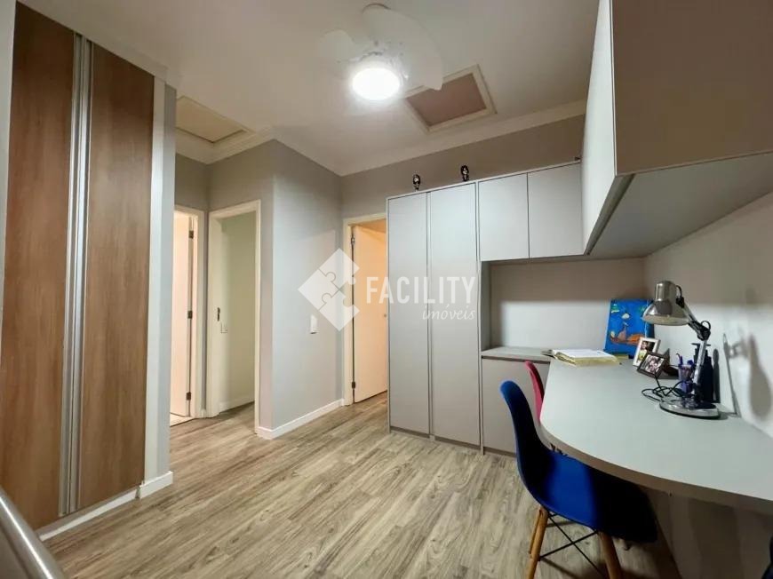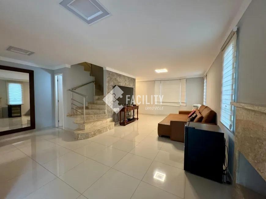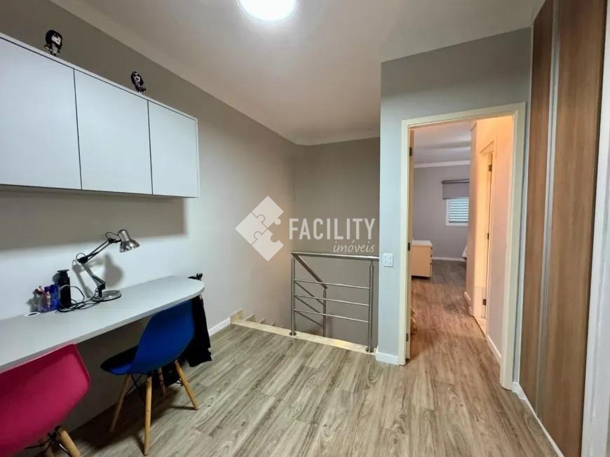 Sobrado com 160m², 03 quartos sendo uma suíte com closet e sacada, sala 3 ambientes com lareira, hall de entrada com lavabo, escritório no piso superior, cozinha americana, área gourmet com fechamento em vidro e integrada a área social, banheiro externo, banheiro social, área de serviço independente e quintal. O imóvel ainda com ótimo acabamento, ar condicionado em todos os dormitórios, quintal com jardim e chuveirão, armários planejados, corredor de acesso lateral, despensa e 3 vagas de garagem.
