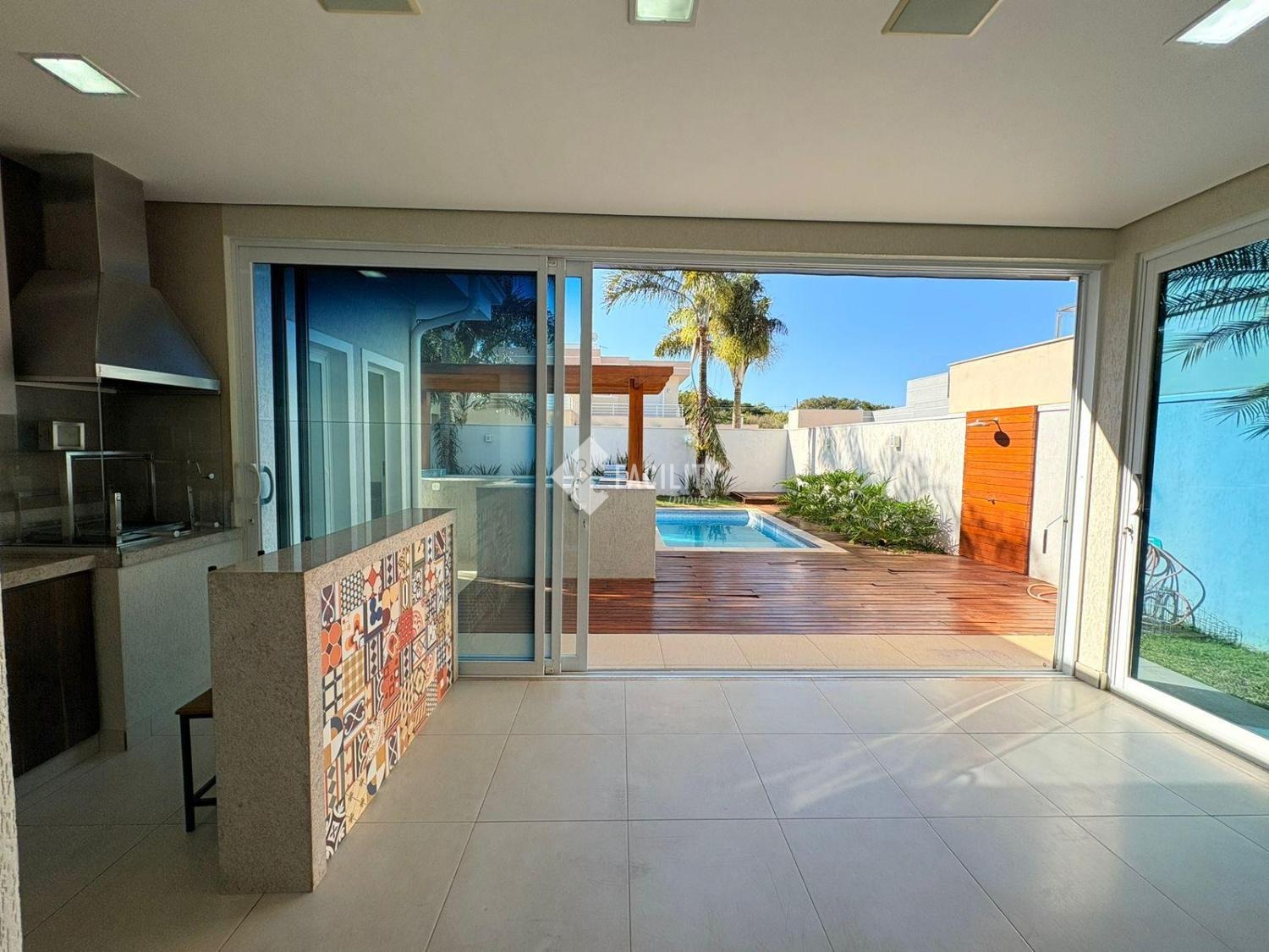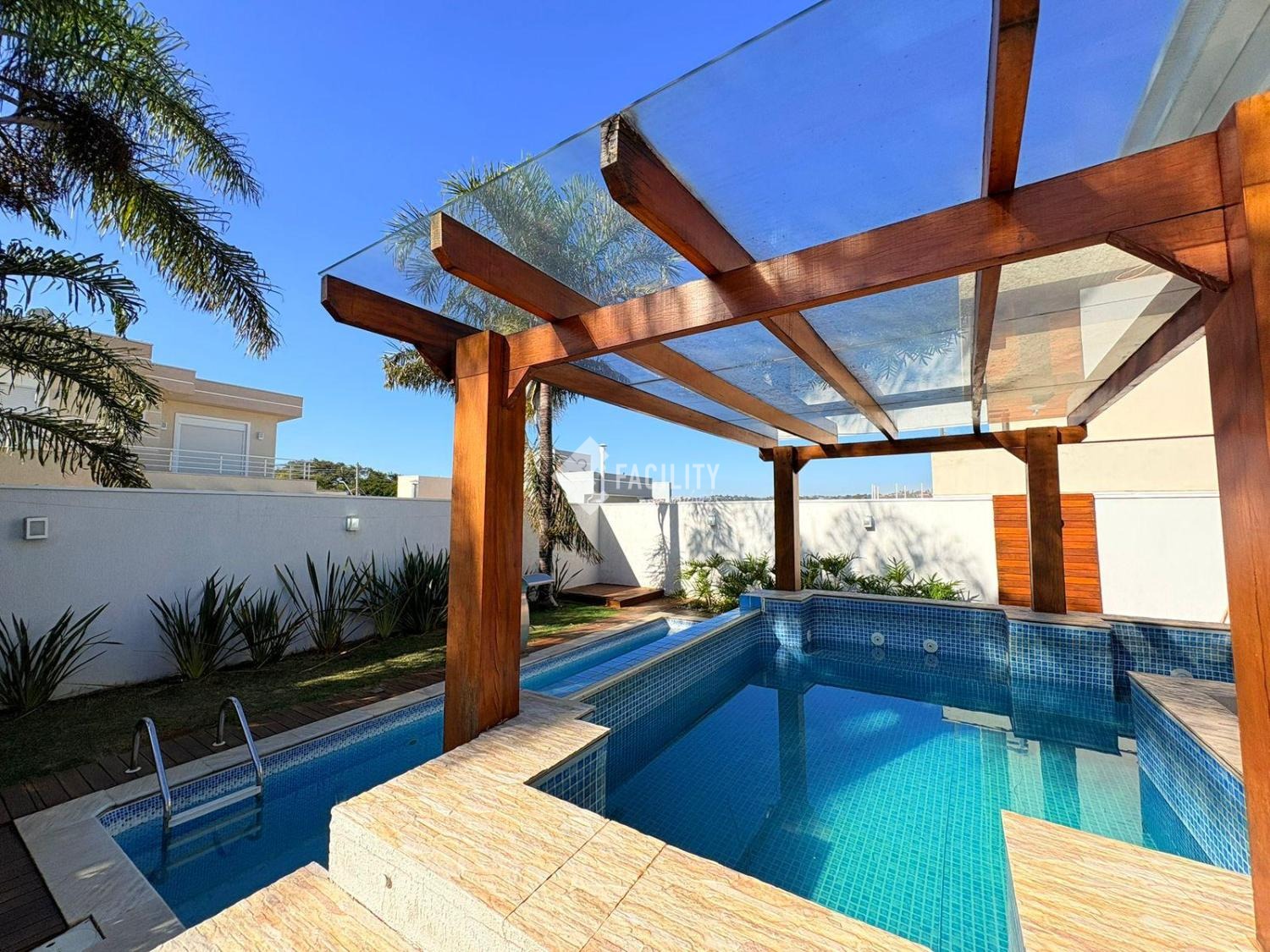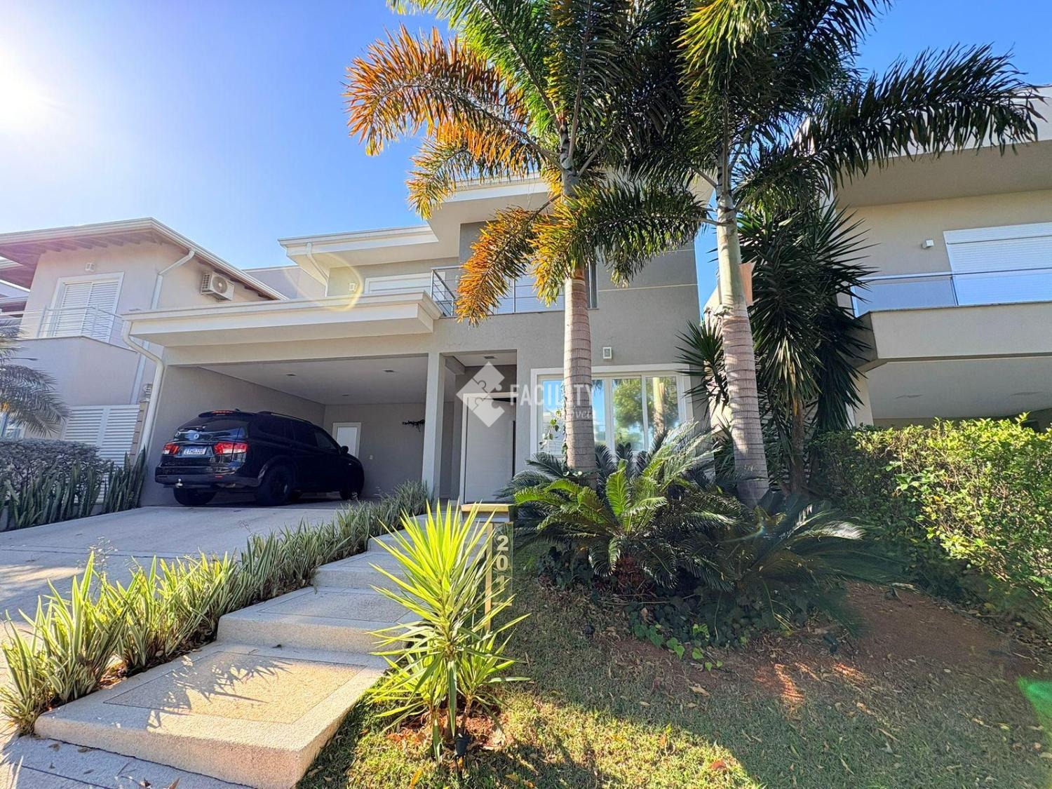 A casa conta com 3 suítes sendo uma master com closet, escritório, cozinha planejada, espaço gourmet com ar-condicionado, ofurô para até 10 pessoas, piscina com prainha, quintal amplo e garagem para 4 carros sendo 2 cobertas. Corredores laterais nos dois lados da casa.