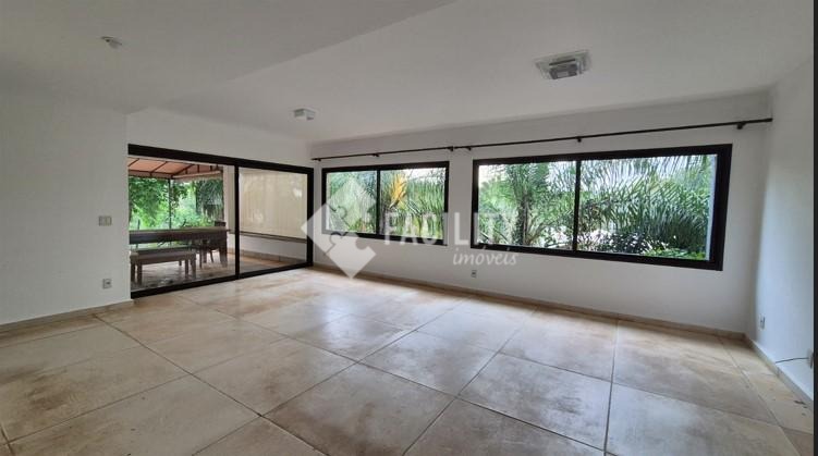 Duas salas integradas, piso cerâmico medindo 1x1m, sala com lareira, vidros amplos, aproveitando bem a luz solar.
