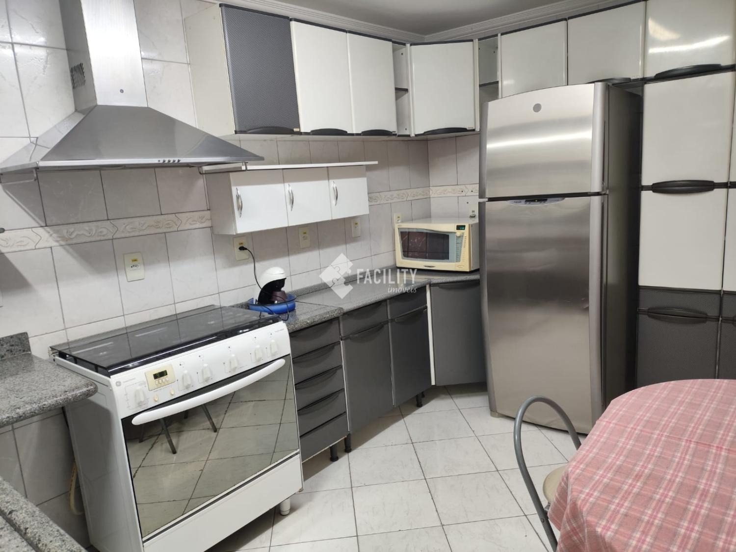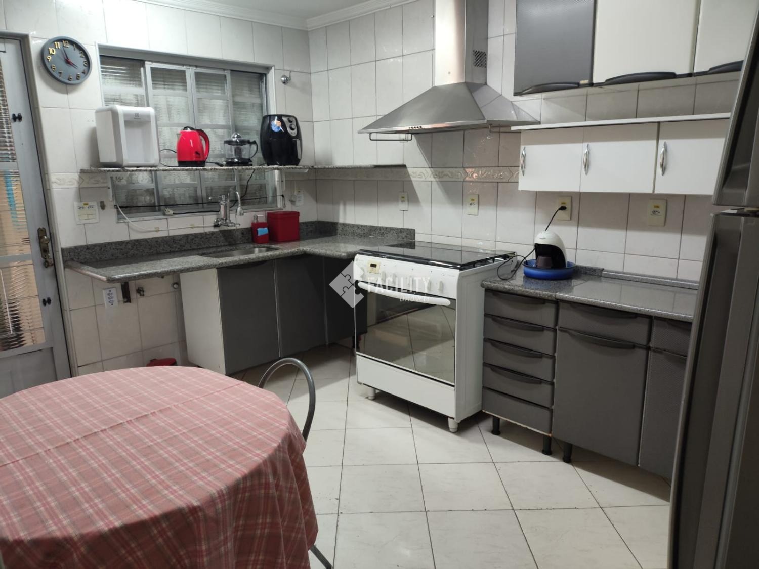Cozinha com azulejo até o teto, coifa, armários planejados e despensa.
