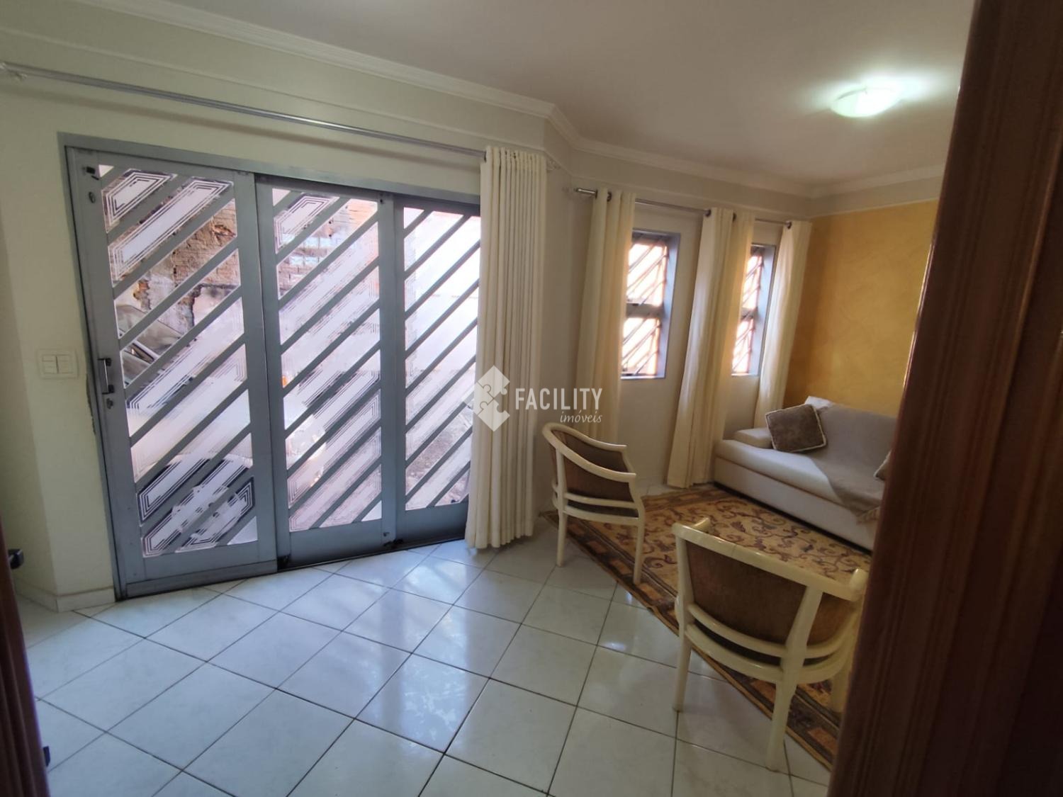 Sala de Estar ampla com painel grafiato, porta de correr para acesso externo e porta de vidro para privacidade do restante da casa.