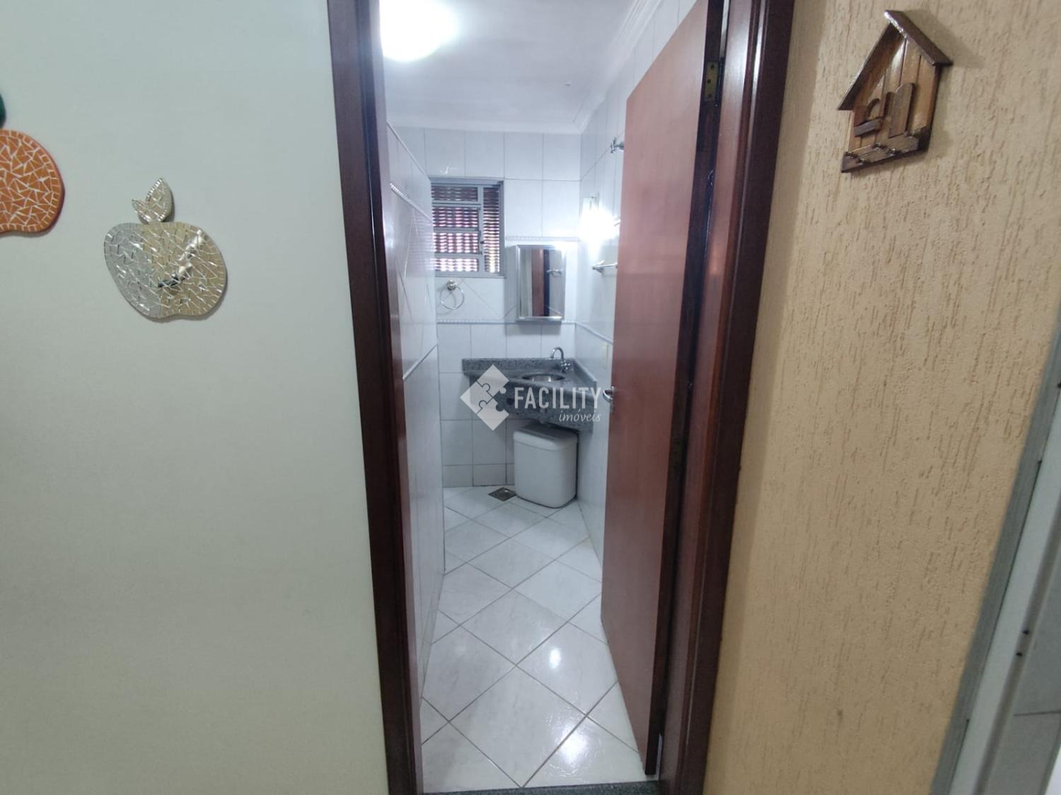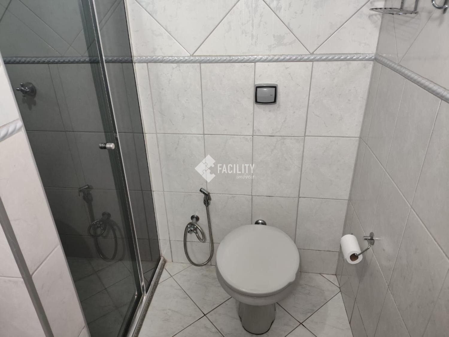 Banheiro social com azulejos até o teto, box vidro, ducha higiênica, pia granito e cuba inox.