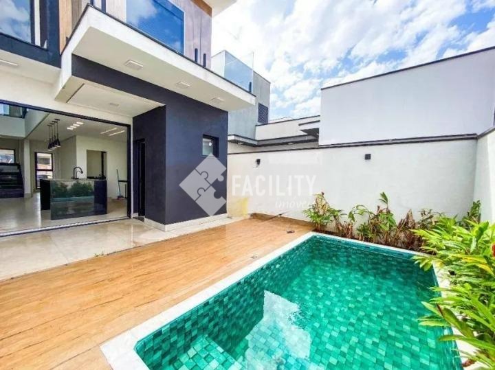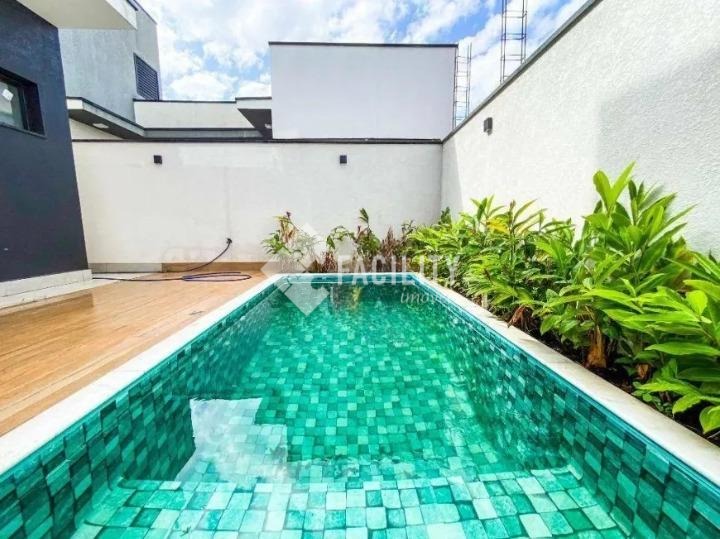 Sobrado com 3 suítes, escritório, piscina com hidro e cascata, área gourmet e 4 vagas, em condomínio fechado com lazer completo e excelente localização em Paulínia.