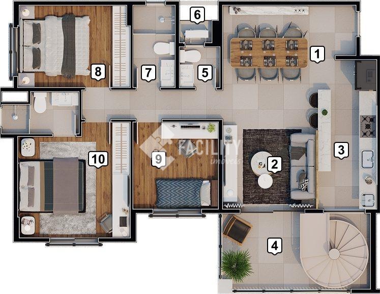 Cobertura duplex com 166 m², 3 dormitórios sendo 1 suíte, sala para 2 ambientes, terraço com espaço gourmet e SPA, 2 vagas de garagem cobertas tipo gaveta.