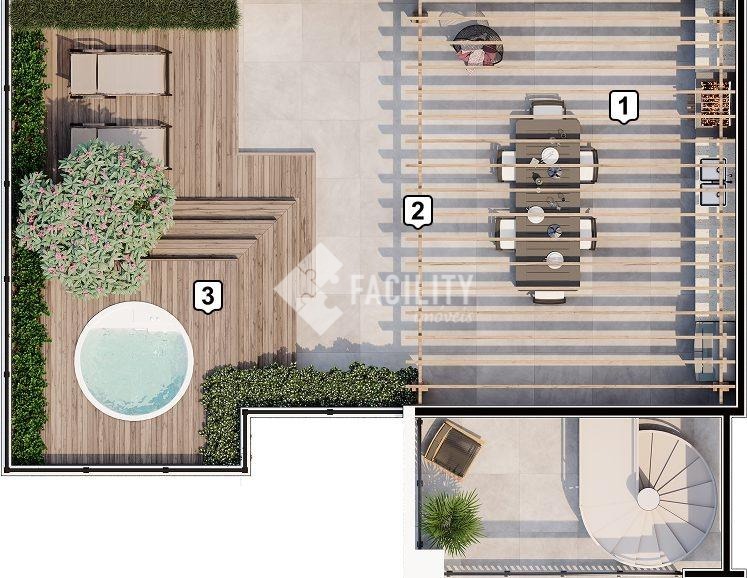 No piso superior, o destaque fica para o amplo terraço com espaço gourmet e SPA, ideal para momentos de lazer e para receber amigos e familiares.