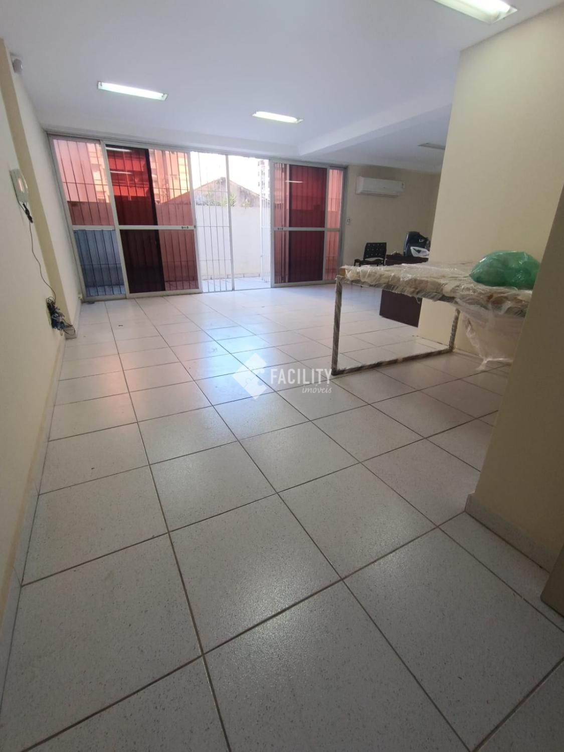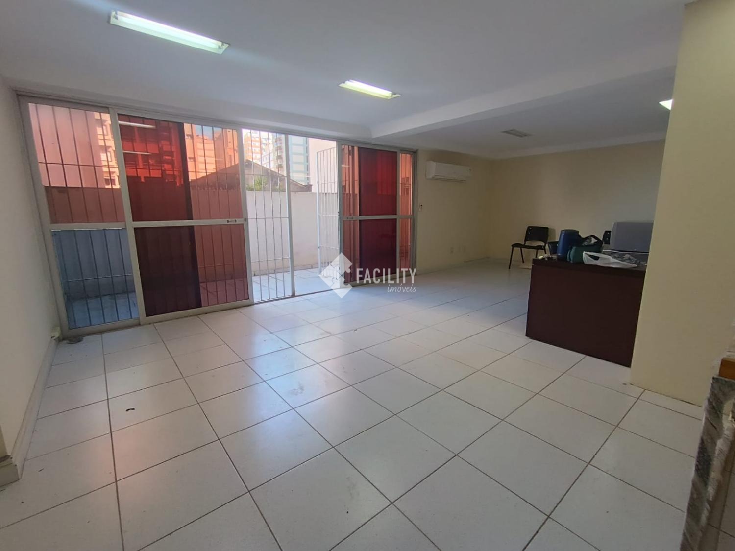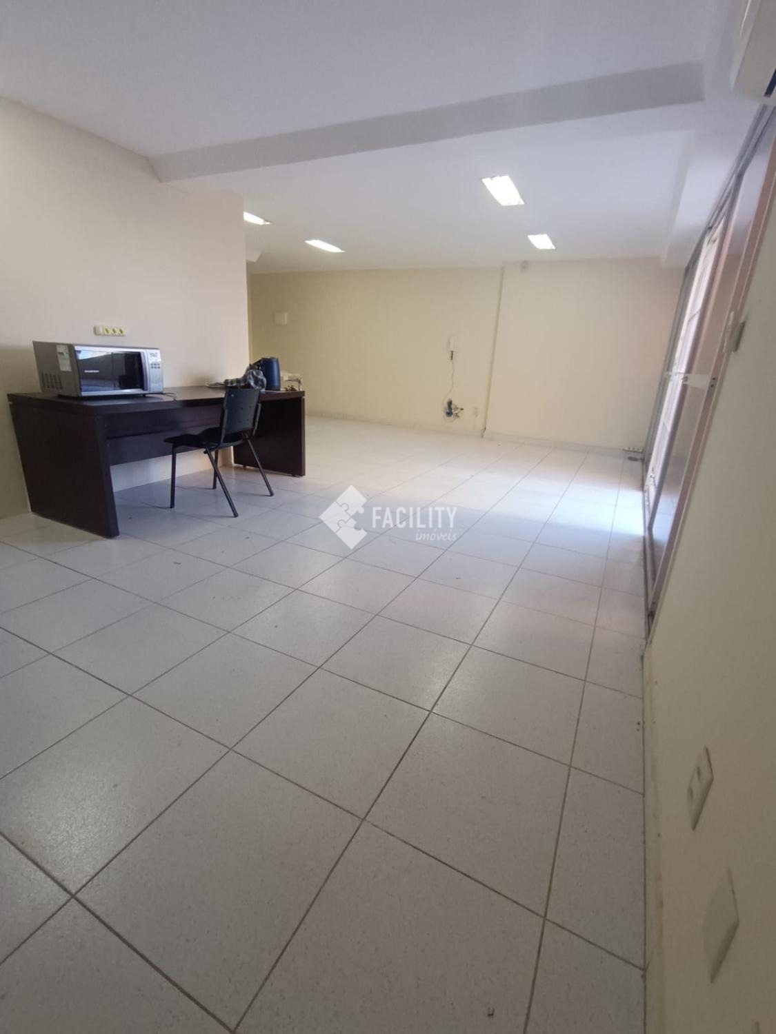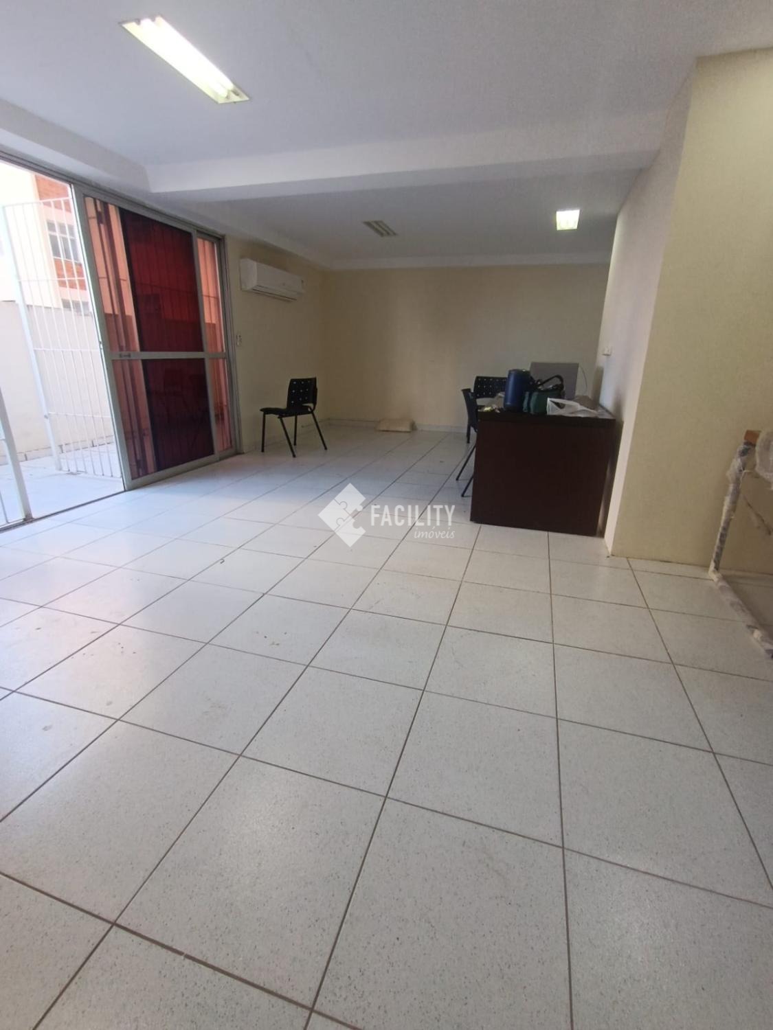 Sala ampla bem arejada, com janelas de vidro, ar condicionado, bem iluminada, com banheiro, copa, área externa ampla, com grade.