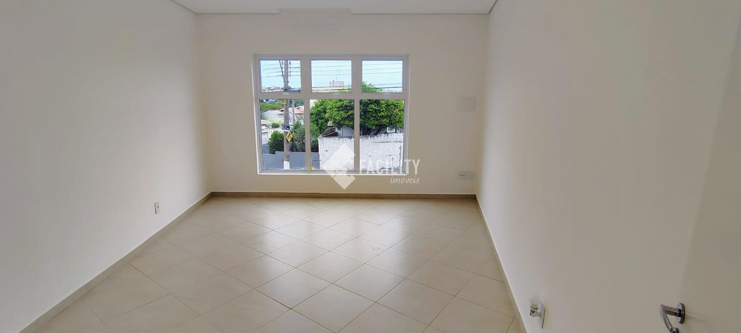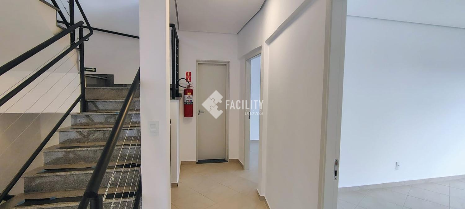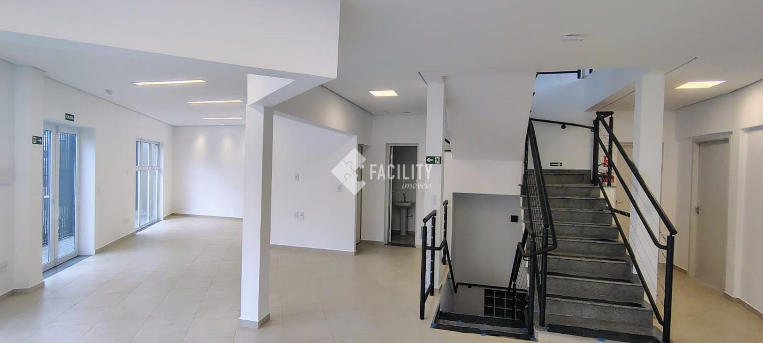 Pavimento inferior com duas salas e área de serviço, pavimento térreo com recepção e mais quatro salas, pavimento superior com um salão de 150m², seis banheiros no total, dez vagas de garagem. Localização excelente.